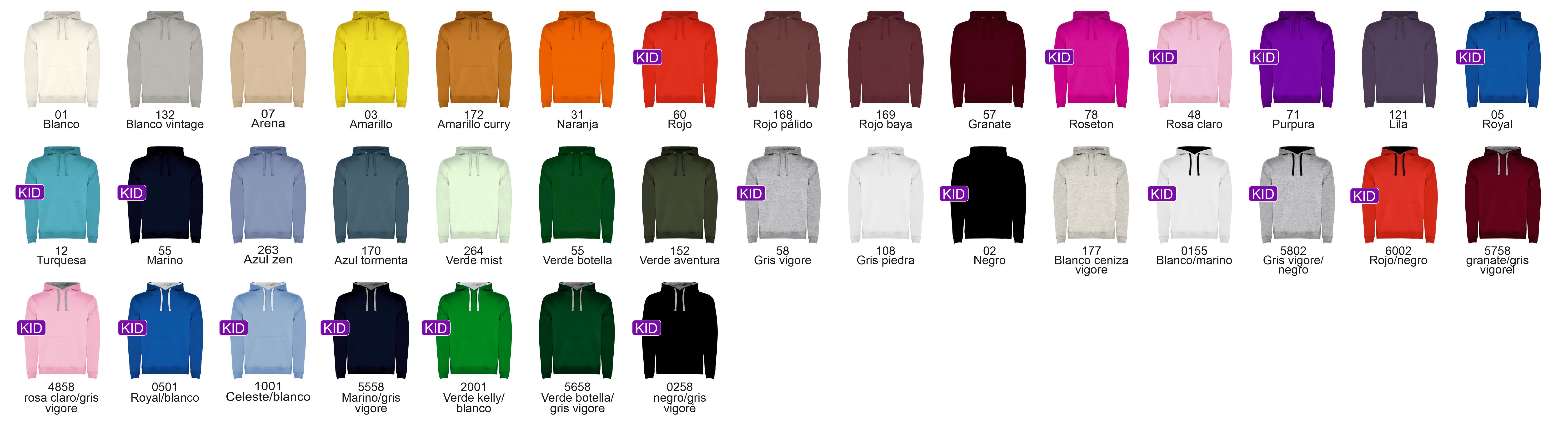 Sudadera con capucha forrada. Puños y cinturilla en canalé 2x1 con elastano. Cubrecosturas del mismo tejido. Cordón plano en capucha. Opciones de colores con capucha a contraste y ojales metálicos al tono.