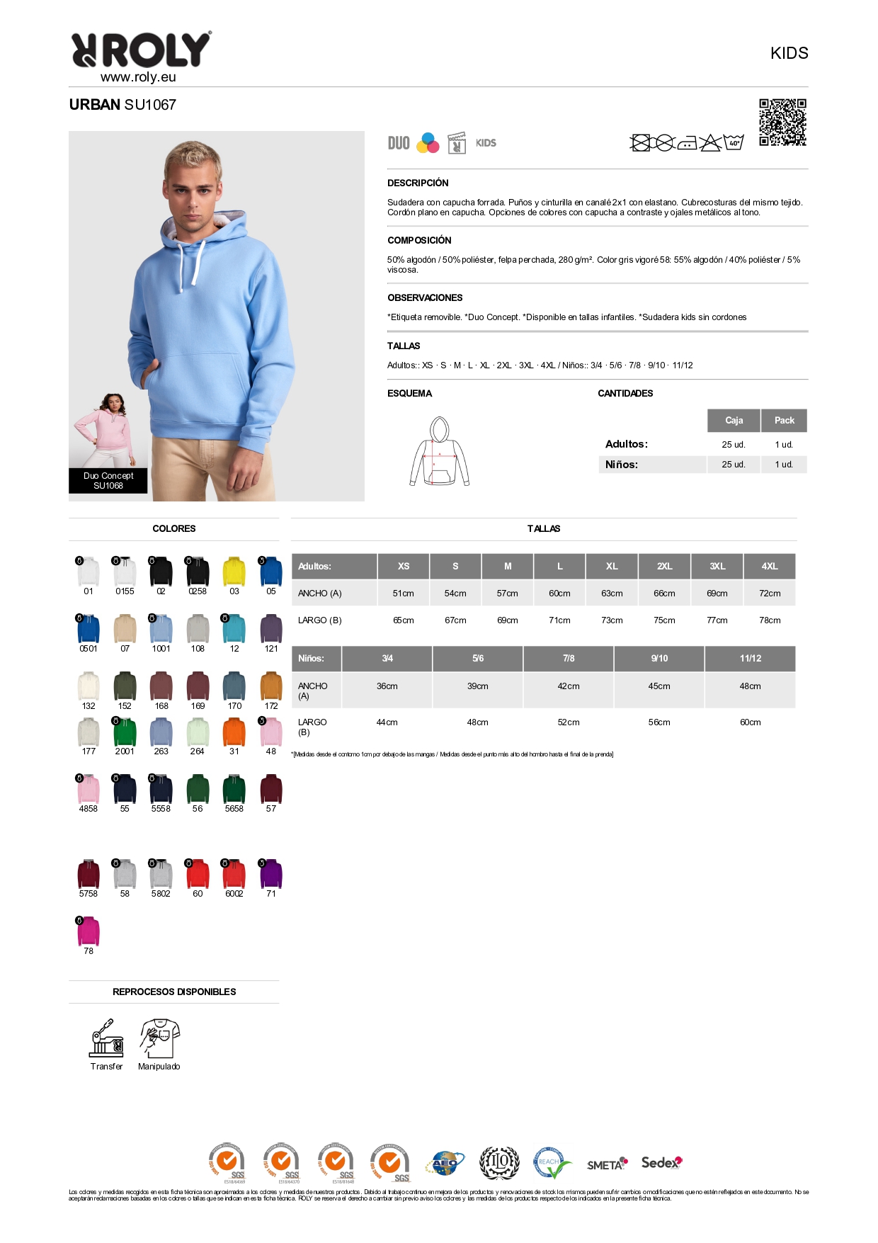 Material: 50% algodón / 50% poliéster, felpa perchada, 280 g/m². Color gris vigoré 58: 55% algodón / 40% poliéster / 5% viscosa.